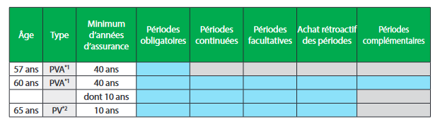 Le tableau ci-dessous présente les différentes périodes d’assurance prises en compte pour le calcul du droit à la pension vieillesse classique ou anticipée :