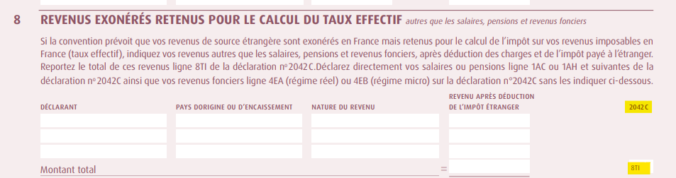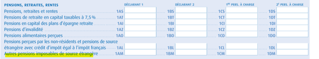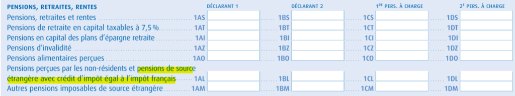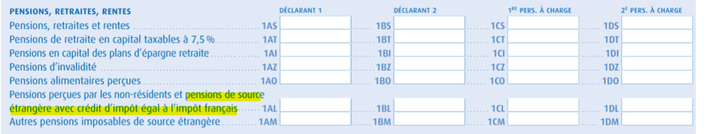 Cette pension est imposée en Suisse mais doit tout de même être renseignée sur la déclaration fiscale française, formulaire 2047 (feuillet rose) et formulaire 2042 1AL (et suivants en fonction du déclarant – feuillet bleu) avec report en 8TK :