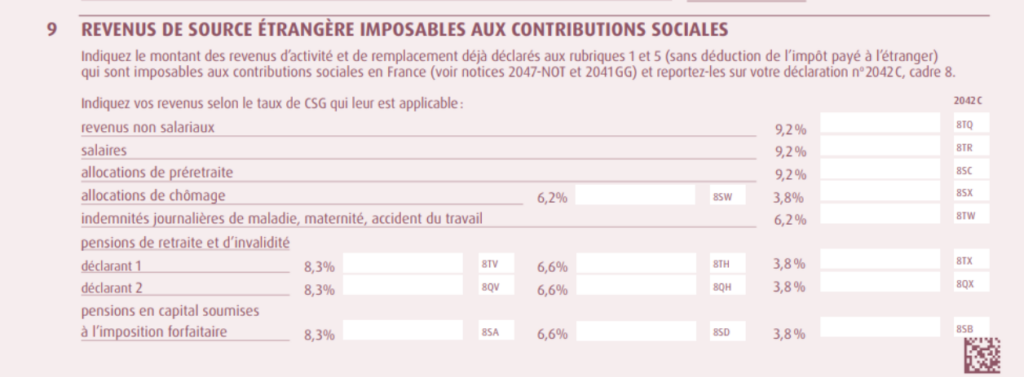 Voici les rubriques (formulaire 2042 C et 2047) à remplir sur votre déclaration fiscale française pour le prélèvement de la CSG-CRDS CASA sur votre pension étrangère. Les prélèvements sur la retraite étrangère ne se font pas mensuellement, mais annuellement.