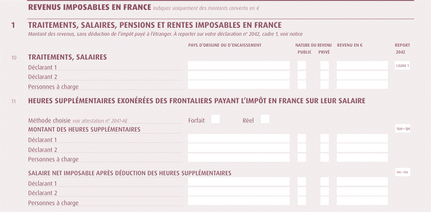 📌 À déclarer : Les frontaliers portent sur les formulaires 2042 et 2047le montant des salaires du privé (ensemble des rémunérations, y compris les avantages en nature provenant d’Allemagne diminués des cotisations sociales mais non diminués de l’impôt allemand).